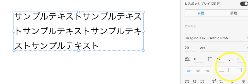 エリア内テキスト(黄色の丸の中の一番右にあるボタン)を押して、テキストの横幅を固定します。